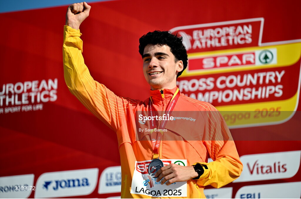 14 December 2025; Oscar Gaitan of Spain with his silver medal after the U20 men's race during the 2025 SPAR European Cross Country Championships in Lagoa, Portugal. Photo by Sam Barnes/Sportsfile