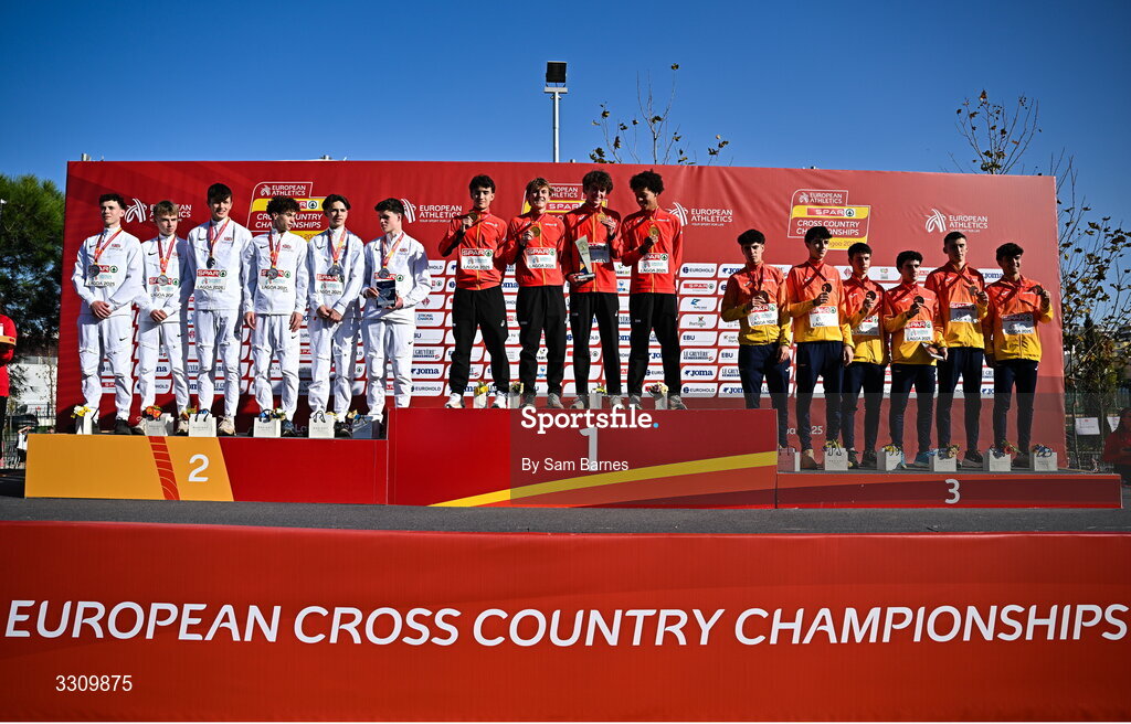 14 December 2025; The U20 men's team podium, from left, Great Britain, silver; Belgium, gold; and Spain, bronze; during the 2025 SPAR European Cross Country Championships in Lagoa, Portugal. Photo by Sam Barnes/Sportsfile