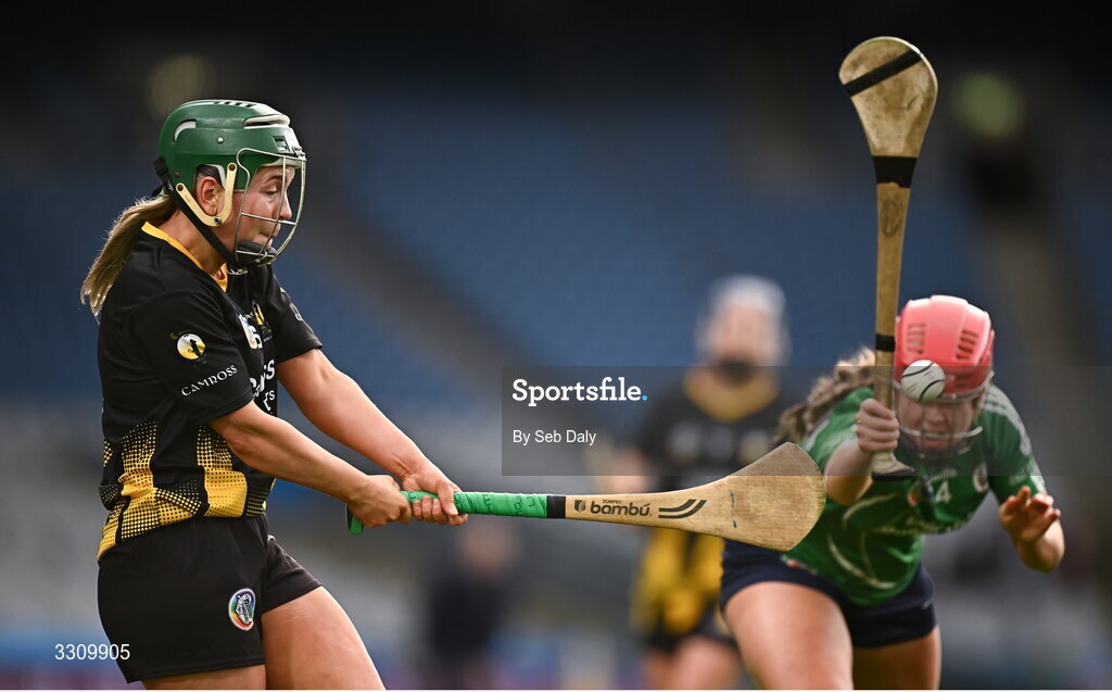 14 December 2025; Donnagh Mortimer of Camross in action against Tara Goulding of Ballincollig during the AIB All-Ireland Camogie Intermediate Club Championship final match between Ballincollig of Cork and Camross of Laois at Croke Park in Dublin. Photo by Seb Daly/Sportsfile