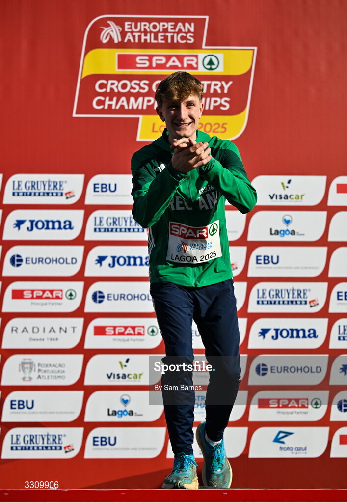 14 December 2025; Nick Griggs of Ireland on the podium after the U23 men's race during the 2025 SPAR European Cross Country Championships in Lagoa, Portugal. Photo by Sam Barnes/Sportsfile