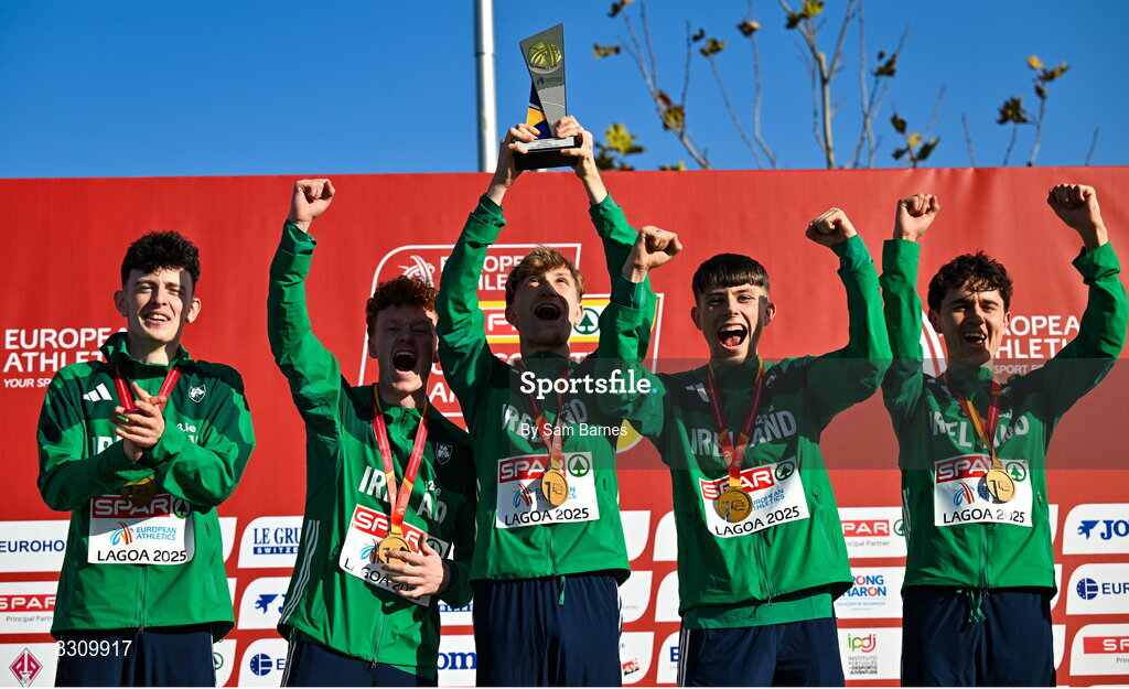 14 December 2025; The winning Ireland U23 men's team, from left, Niall Murphy, Lughaidh Mallon, Nick Griggs, Callum Morgan, Jonas Stafford, with their gold medals during the 2025 SPAR European Cross Country Championships in Lagoa, Portugal. Photo by Sam Barnes/Sportsfile