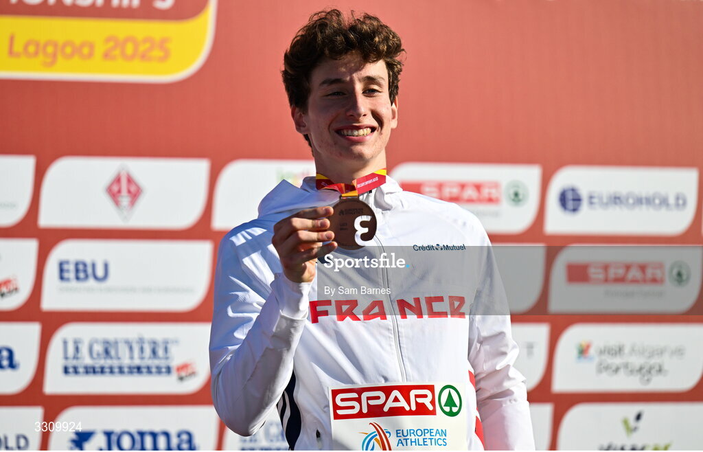 14 December 2025; Pierre Boudy of France with his bronze medal after the U23 men's race during the 2025 SPAR European Cross Country Championships in Lagoa, Portugal. Photo by Sam Barnes/Sportsfile