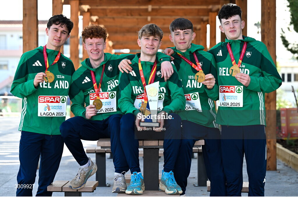 14 December 2025; The winning Ireland U23 men's team, from left, Jonas Stafford, Lughaidh Mallon, Nick Griggs, Callum Morgan and Niall Murphy with their gold medals during the 2025 SPAR European Cross Country Championships in Lagoa, Portugal. Photo by Sam Barnes/Sportsfile