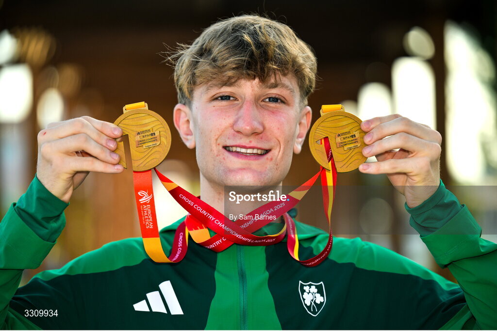 14 December 2025; Nick Griggs of Ireland with his U23 men's individual and team gold medals during the 2025 SPAR European Cross Country Championships in Lagoa, Portugal. Photo by Sam Barnes/Sportsfile