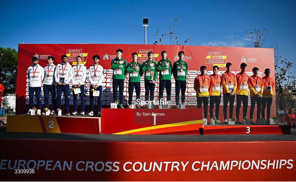 14 December 2025; The U23 men's team podium, from left, France, Ireland and Spain during the 2025 SPAR European Cross Country Championships in Lagoa, Portugal. Photo by Sam Barnes/Sportsfile