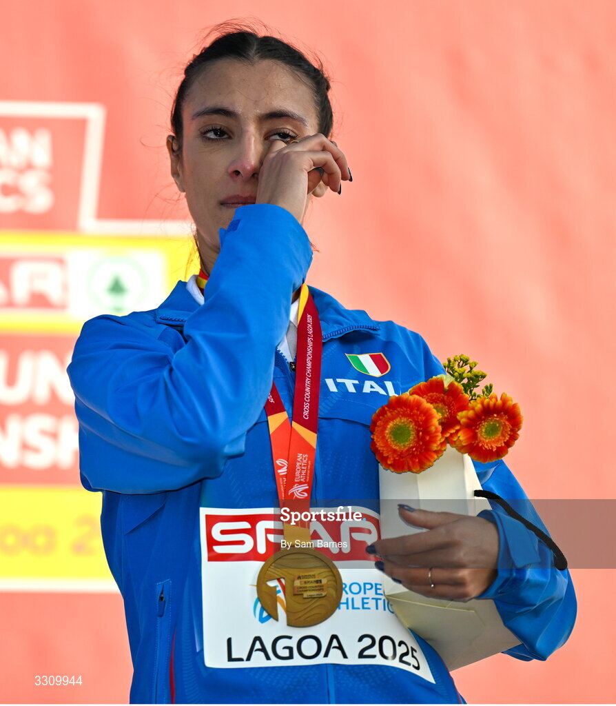 14 December 2025; Gold medalist Nadia Battocletti of Italy after the senior women's race during the 2025 SPAR European Cross Country Championships in Lagoa, Portugal. Photo by Sam Barnes/Sportsfile
