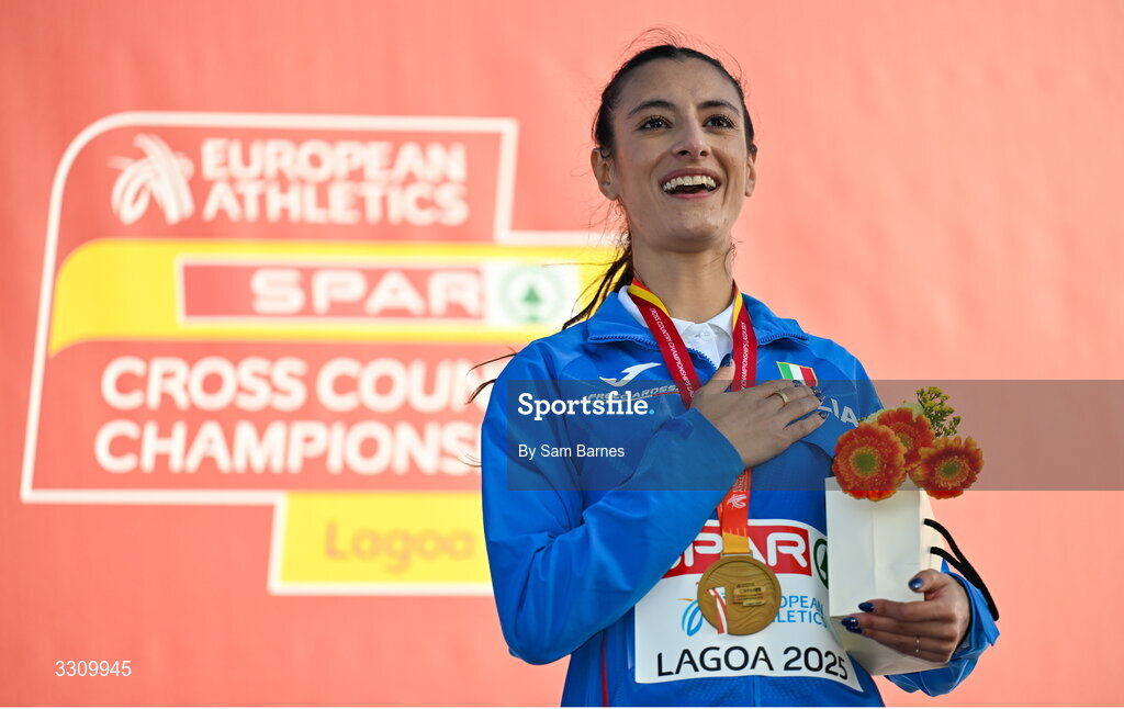 14 December 2025; Gold medalist Nadia Battocletti of Italy after the senior women's race during the 2025 SPAR European Cross Country Championships in Lagoa, Portugal. Photo by Sam Barnes/Sportsfile