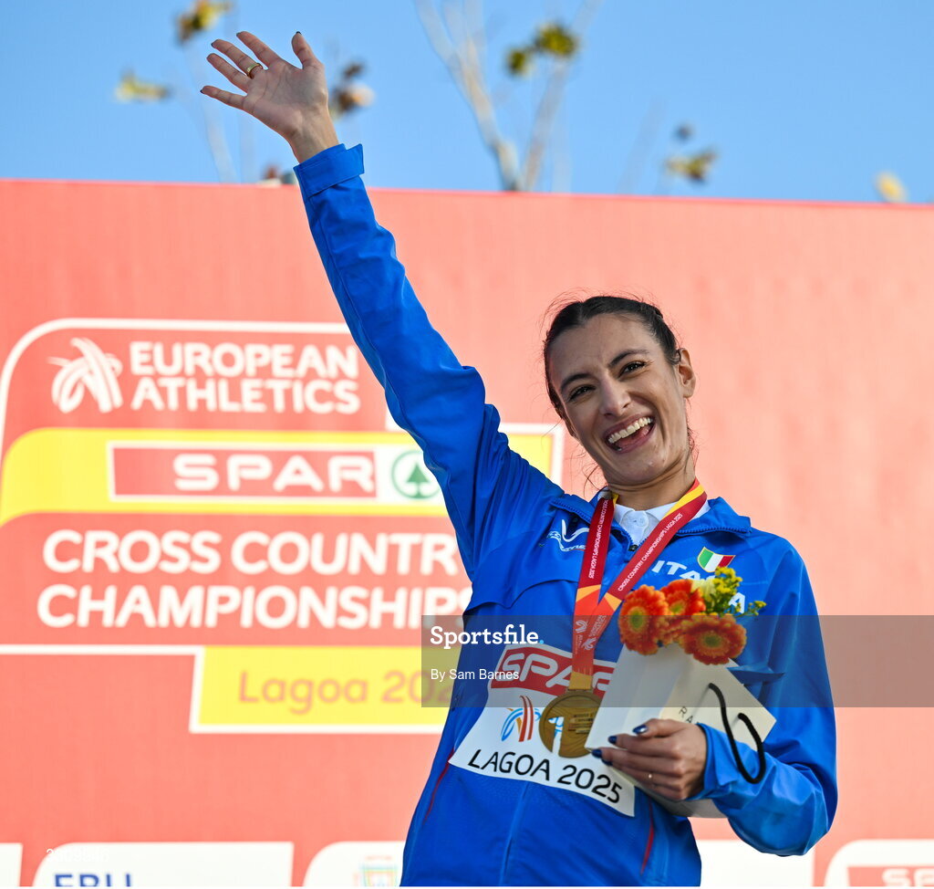 14 December 2025; Gold medalist Nadia Battocletti of Italy after the senior women's race during the 2025 SPAR European Cross Country Championships in Lagoa, Portugal. Photo by Sam Barnes/Sportsfile