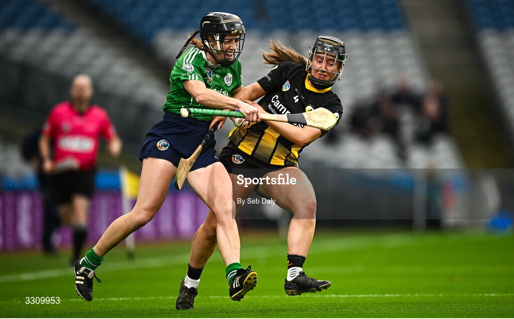 14 December 2025; Linda Dorgan of Ballincollig in action against Fiona Scully of Camross during the AIB All-Ireland Camogie Intermediate Club Championship final match between Ballincollig of Cork and Camross of Laois at Croke Park in Dublin. Photo by Seb Daly/Sportsfile