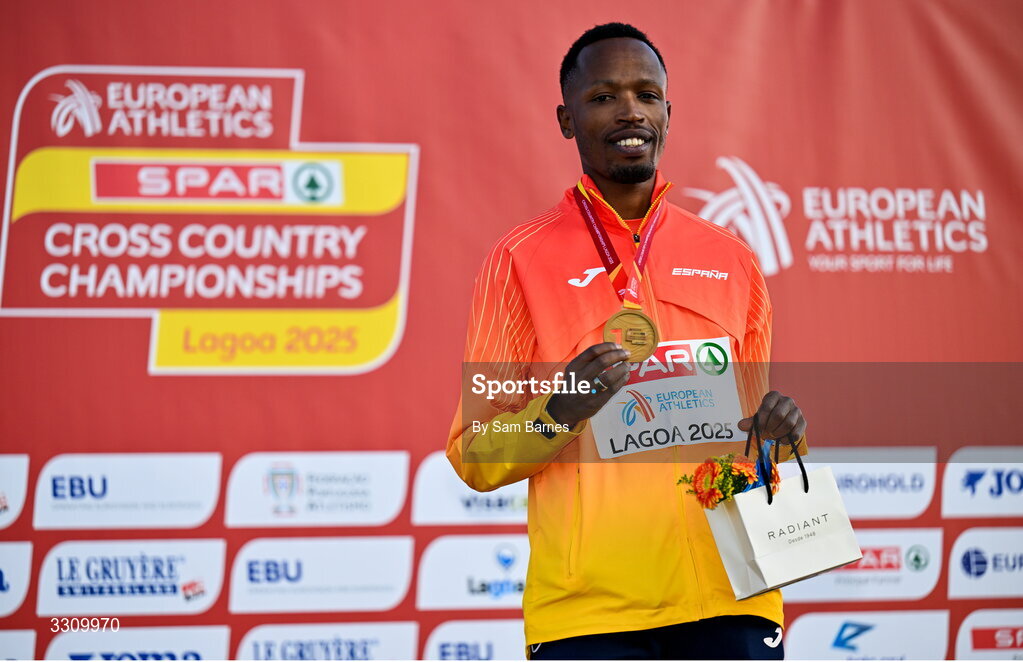 14 December 2025; Thierry Ndikumwenayo of Spain with his gold medal after the senior men's race during the 2025 SPAR European Cross Country Championships in Lagoa, Portugal. Photo by Sam Barnes/Sportsfile