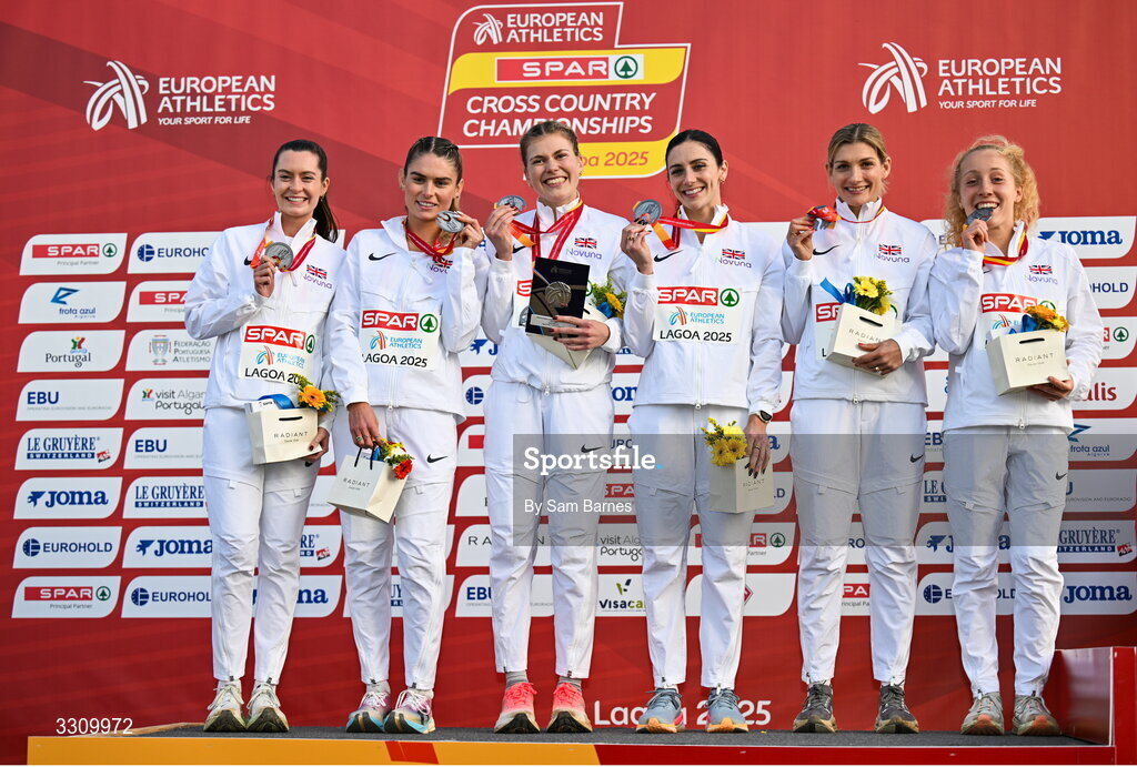 14 December 2025; The Great Britain senior women's team with their silver medals during the 2025 SPAR European Cross Country Championships in Lagoa, Portugal. Photo by Sam Barnes/Sportsfile