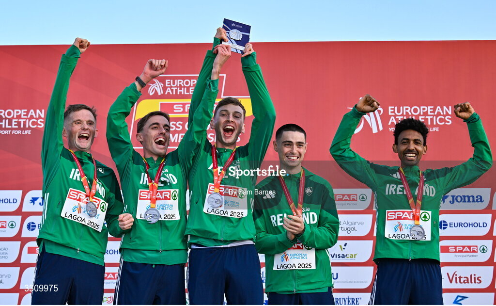 14 December 2025; The second placed Ireland team, from left, Jack O'Leary, Brian Fay, Cormac Dalton, Darragh McElhinney and Efrem Gidey on the podium with their silver medals during the 2025 SPAR European Cross Country Championships in Lagoa, Portugal. Photo by Sam Barnes/Sportsfile