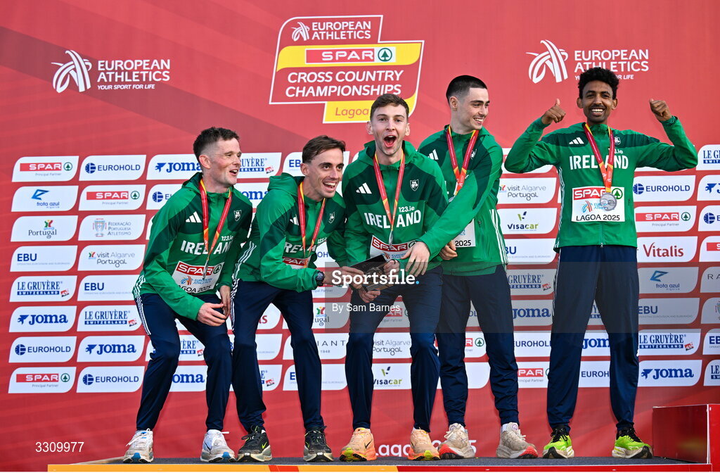 14 December 2025; The second placed Ireland team, from left, Jack O'Leary, Brian Fay, Cormac Dalton, Darragh McElhinney and Efrem Gidey on the podium with their silver medals during the 2025 SPAR European Cross Country Championships in Lagoa, Portugal. Photo by Sam Barnes/Sportsfile