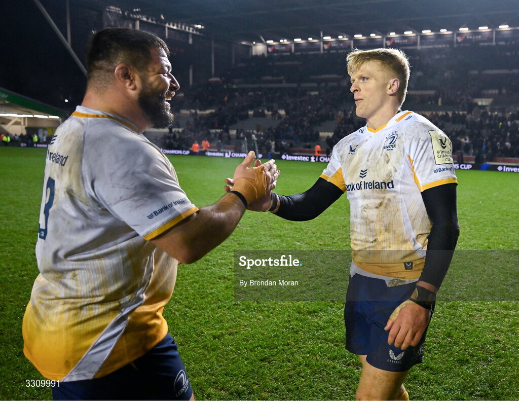 12 December 2025; Tommy O'Brien, right, and Rabah Slimani of Leinster after the Investec Champions Cup match between Leicester Tigers and Leinster at Mattioli Woods Welford Road in Leicester, England. Photo by Brendan Moran/Sportsfile