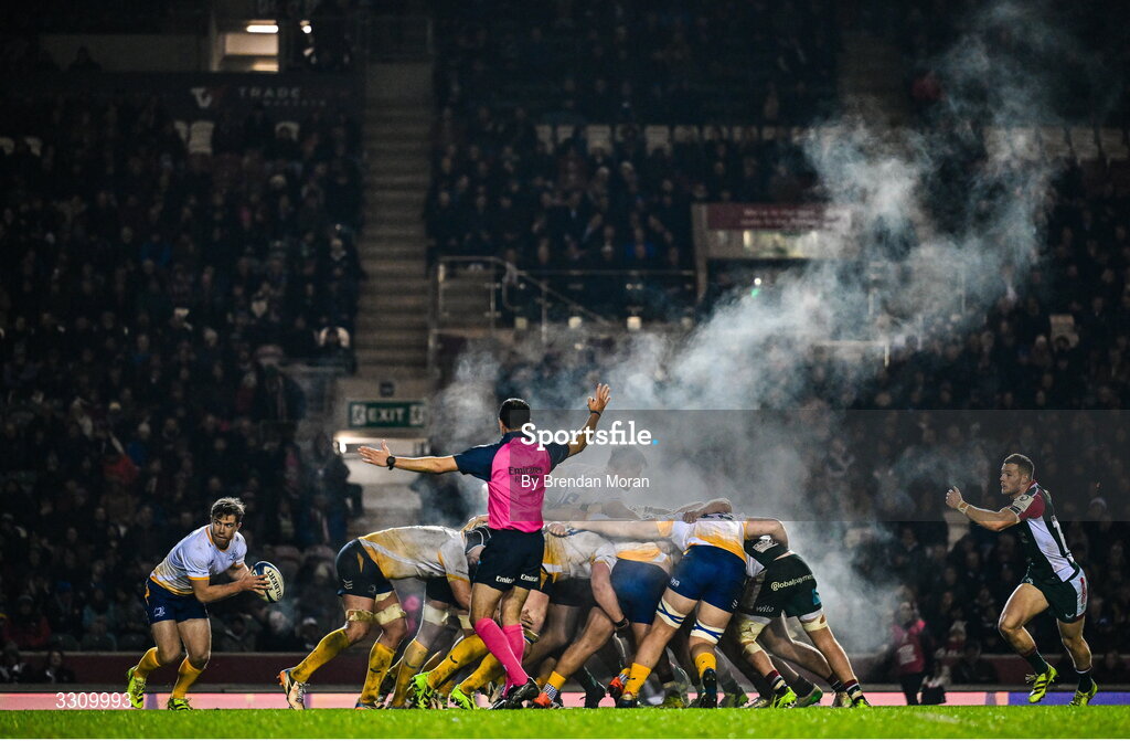 12 December 2025; Luke McGrath of Leinster takes the ball from a scrum to set up an attack during the Investec Champions Cup match between Leicester Tigers and Leinster at Mattioli Woods Welford Road in Leicester, England. Photo by Brendan Moran/Sportsfile