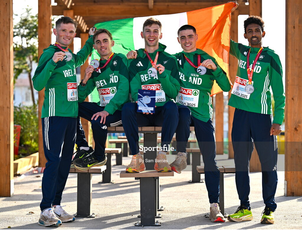 14 December 2025; The second placed Ireland team, from left, Jack O'Leary, Brian Fay, Cormac Dalton, Darragh McElhinney and Efrem Gidey on the podium with their silver medals during the 2025 SPAR European Cross Country Championships in Lagoa, Portugal. Photo by Sam Barnes/Sportsfile