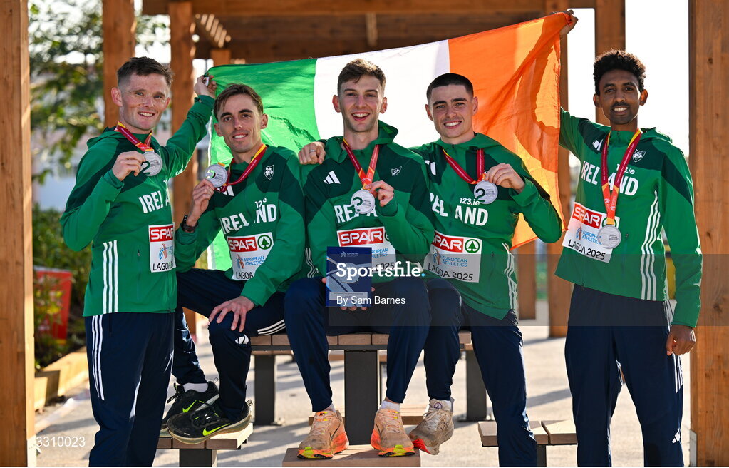 14 December 2025; The second placed Ireland team, from left, Jack O'Leary, Brian Fay, Cormac Dalton, Darragh McElhinney and Efrem Gidey on the podium with their silver medals during the 2025 SPAR European Cross Country Championships in Lagoa, Portugal. Photo by Sam Barnes/Sportsfile