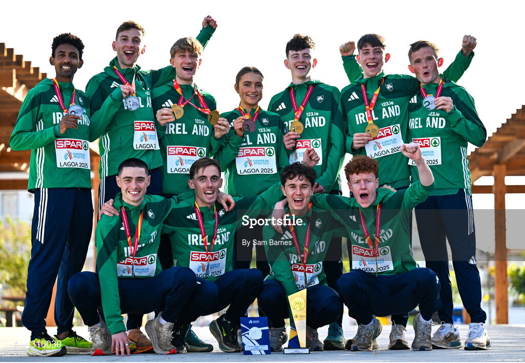 14 December 2025; Ireland medalists, back row, from left, Efrem Gidey, Cormac Dalton, Nick Griggs, Emma Hickey, Niall Murphy, Callum Morgan, Jack O'Leary; front row, from left, Darragh McElhinney, Brian Fay, Jonas Stafford and Lughaidh Mallon with their medals after the 2025 SPAR European Cross Country Championships in Lagoa, Portugal. Photo by Sam Barnes/Sportsfile