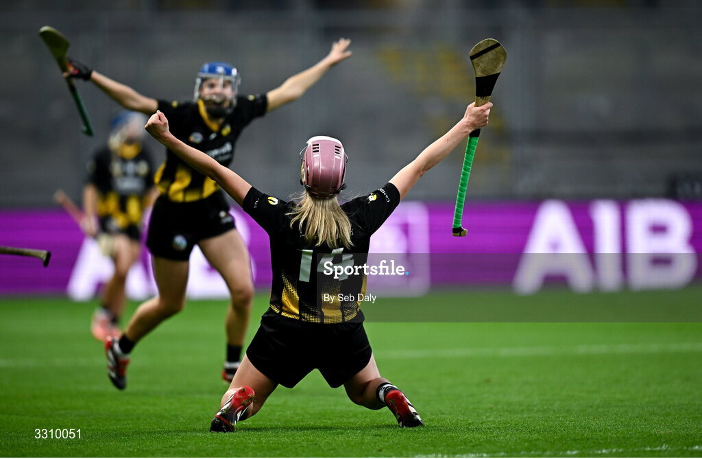 14 December 2025; Sarah-Anne Fitzgerald of Camross celebrates at the final whistle after her side's victory in the AIB All-Ireland Camogie Intermediate Club Championship final match between Ballincollig of Cork and Camross of Laois at Croke Park in Dublin. Photo by Seb Daly/Sportsfile
