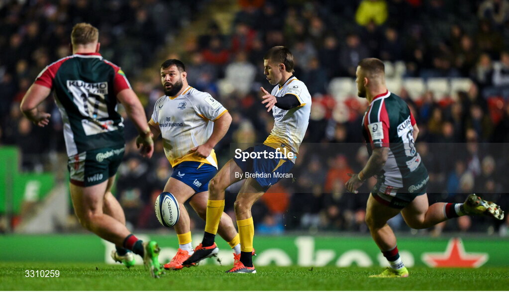12 December 2025; Sam Prendergast of Leinster during the Investec Champions Cup match between Leicester Tigers and Leinster at Mattioli Woods Welford Road in Leicester, England. Photo by Brendan Moran/Sportsfile