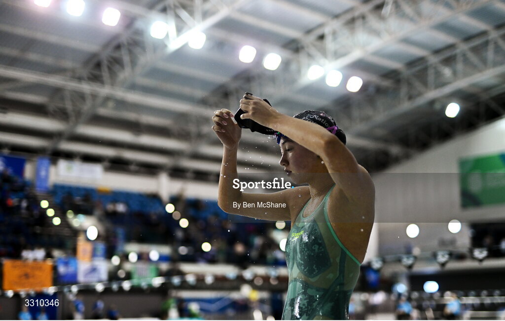 14 December 2025; Lottie Cullen after competing in the Women's 200m Backstroke during day three of the Irish Winter Swimming Championships 2025 at the National Aquatic Centre on the Sport Ireland Campus in Dublin. Photo by Ben McShane/Sportsfile