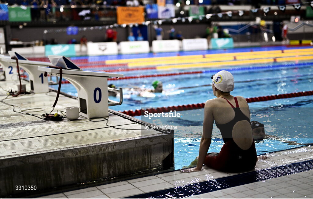 14 December 2025; Holly McInearny reacts after her Women's 200m Backstroke during day three of the Irish Winter Swimming Championships 2025 at the National Aquatic Centre on the Sport Ireland Campus in Dublin. Photo by Ben McShane/Sportsfile