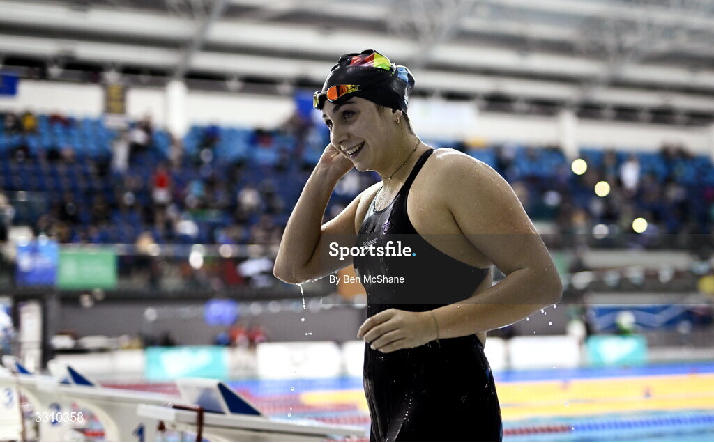 14 December 2025; Federica Martini after winning her 50m Breaststroke during day three of the Irish Winter Swimming Championships 2025 at the National Aquatic Centre on the Sport Ireland Campus in Dublin. Photo by Ben McShane/Sportsfile
