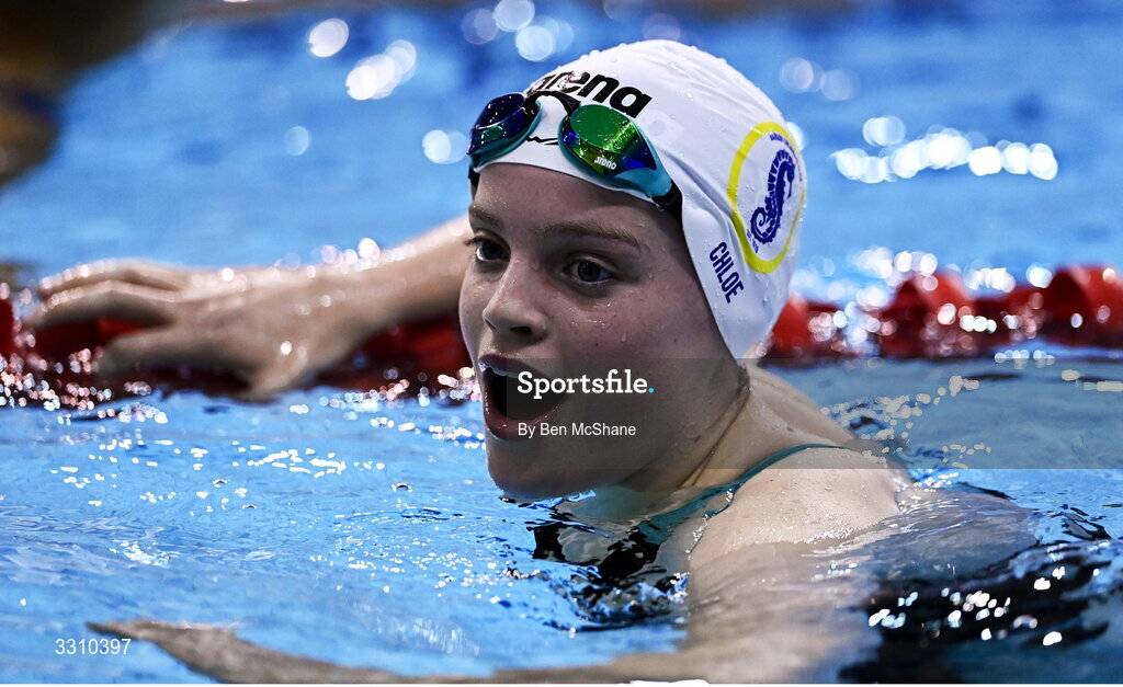 14 December 2025; Chloe Stewart reacts after winning in the Women's 400m Freestyle during day three of the Irish Winter Swimming Championships 2025 at the National Aquatic Centre on the Sport Ireland Campus in Dublin. Photo by Ben McShane/Sportsfile