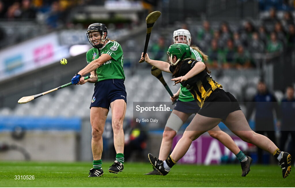 14 December 2025; Linda Dorgan of Ballincollig in action against Luisne Delaney of Camross during the AIB All-Ireland Camogie Intermediate Club Championship final match between Ballincollig of Cork and Camross of Laois at Croke Park in Dublin. Photo by Seb Daly/Sportsfile