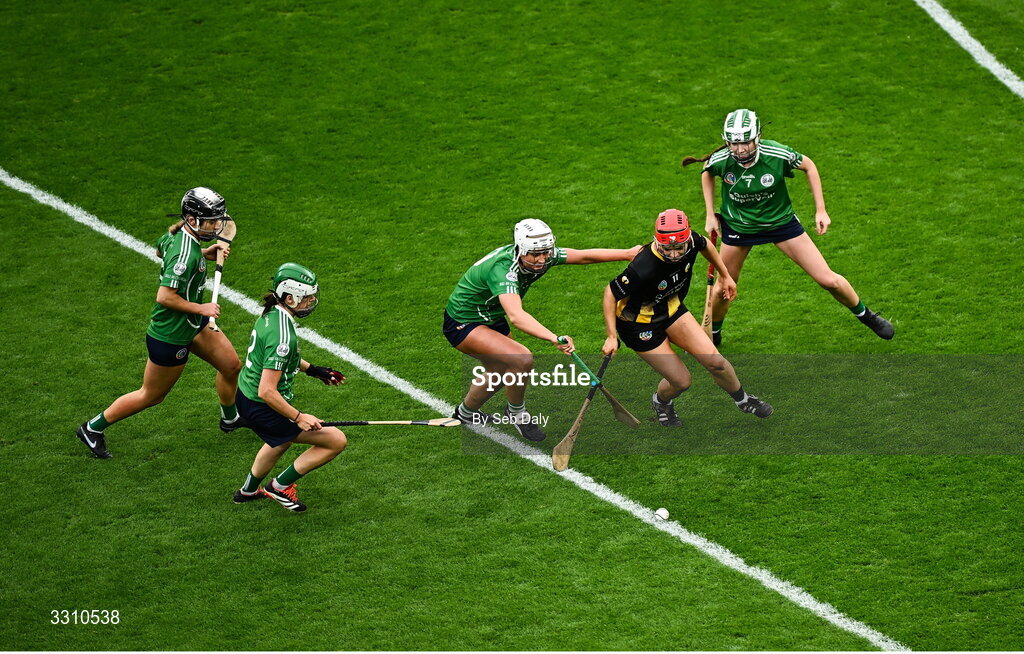 14 December 2025; Gráinne Delaney of Camross in action against Keeley Goulding of Ballincollig during the AIB All-Ireland Camogie Intermediate Club Championship final match between Ballincollig of Cork and Camross of Laois at Croke Park in Dublin. Photo by Seb Daly/Sportsfile