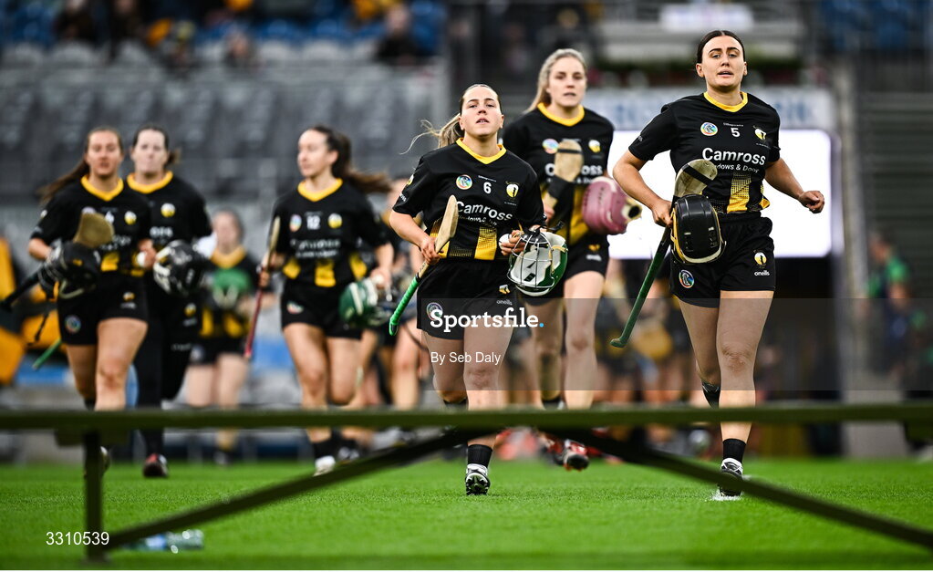 14 December 2025; Camross captain Aoife Collier leads her side out before the AIB All-Ireland Camogie Intermediate Club Championship final match between Ballincollig of Cork and Camross of Laois at Croke Park in Dublin. Photo by Seb Daly/Sportsfile