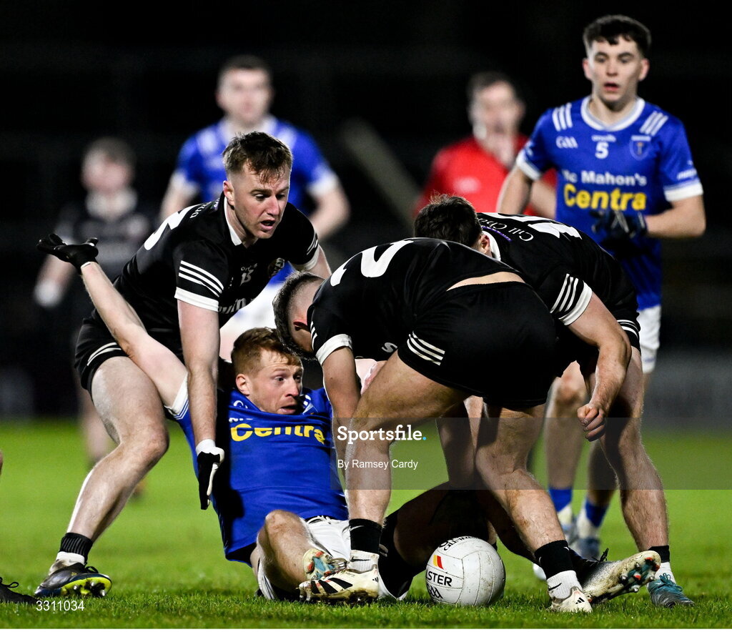 13 December 2025; Kieran Hughes of Scotstown in action against Paul Devlin, left, and Sean Og McCusker of Kilcoo during the AIB Ulster GAA Football Senior Club Championship final match between Kilcoo and Scotstown at BOX-IT Athletic Grounds in Armagh. Photo by Ramsey Cardy/Sportsfile