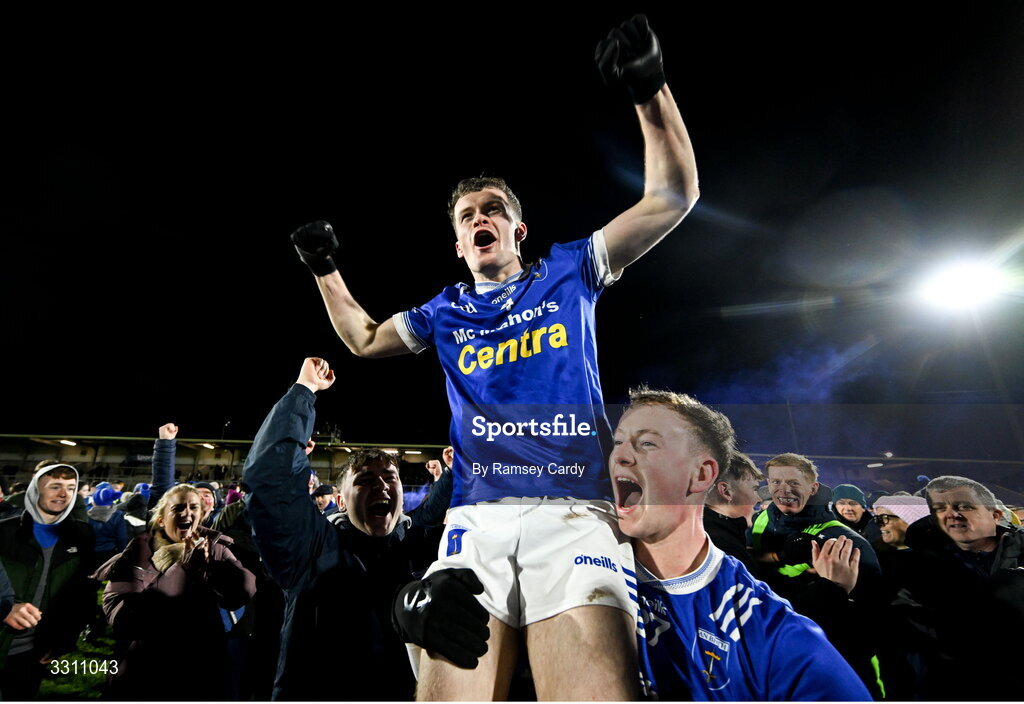 13 December 2025; Darragh Murray is lifted by Scotstown teammate Killian McKenna after the AIB Ulster GAA Football Senior Club Championship final match between Kilcoo and Scotstown at BOX-IT Athletic Grounds in Armagh. Photo by Ramsey Cardy/Sportsfile
