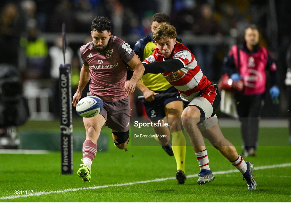 13 December 2025; Paddy Patterson of Munster in action against Rhys Price of Gloucester during the Investec Champions Cup match between Munster and Gloucester at SuperValu Páirc Ui Chaoimh in Cork. Photo by Brendan Moran/Sportsfile