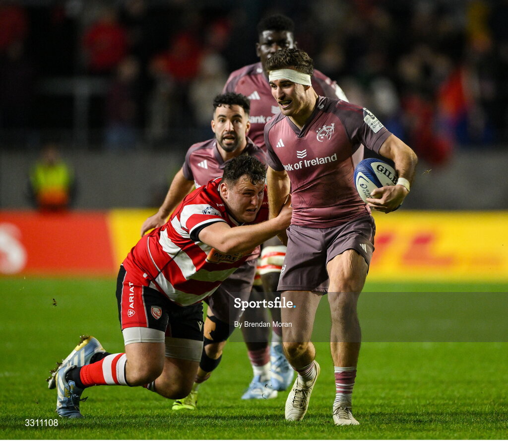 13 December 2025; Shane Daly of Munster is tackled by Ciaran Knight of Gloucester during the Investec Champions Cup match between Munster and Gloucester at SuperValu Páirc Ui Chaoimh in Cork. Photo by Brendan Moran/Sportsfile