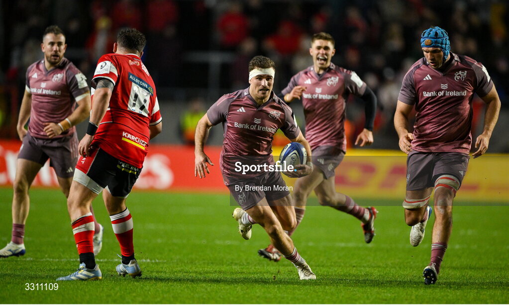 13 December 2025; Shane Daly of Munster makes a break during the Investec Champions Cup match between Munster and Gloucester at SuperValu Páirc Ui Chaoimh in Cork. Photo by Brendan Moran/Sportsfile