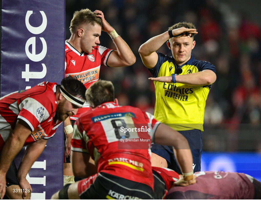 13 December 2025; Referee Ben Breakspear during the Investec Champions Cup match between Munster and Gloucester at SuperValu Páirc Ui Chaoimh in Cork. Photo by Brendan Moran/Sportsfile