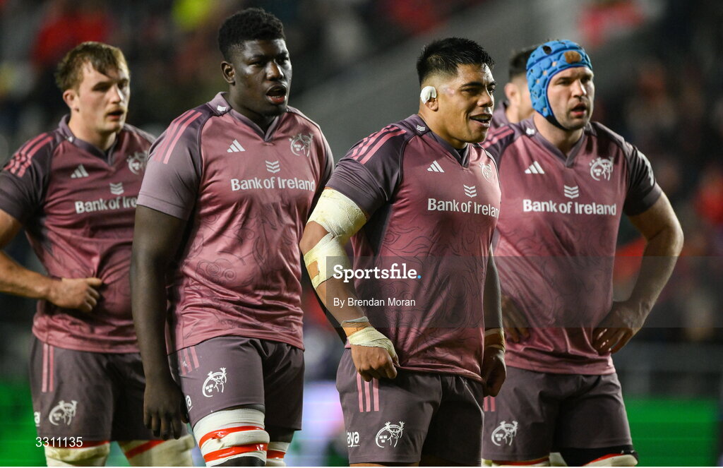 13 December 2025; Munster players, from left, Gavin Coombes, Edwin Edogbo, Michael Ala'alatoa and Tadhg Beirne during the Investec Champions Cup match between Munster and Gloucester at SuperValu Páirc Ui Chaoimh in Cork. Photo by Brendan Moran/Sportsfile