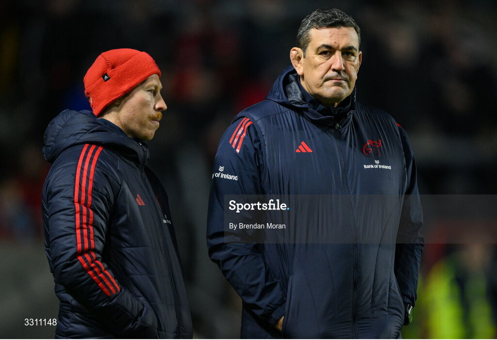 13 December 2025; Munster head coach Clayton McMillan, right, and senior sport psychologist Cathal Sheridan before the Investec Champions Cup match between Munster and Gloucester at SuperValu Páirc Ui Chaoimh in Cork. Photo by Brendan Moran/Sportsfile