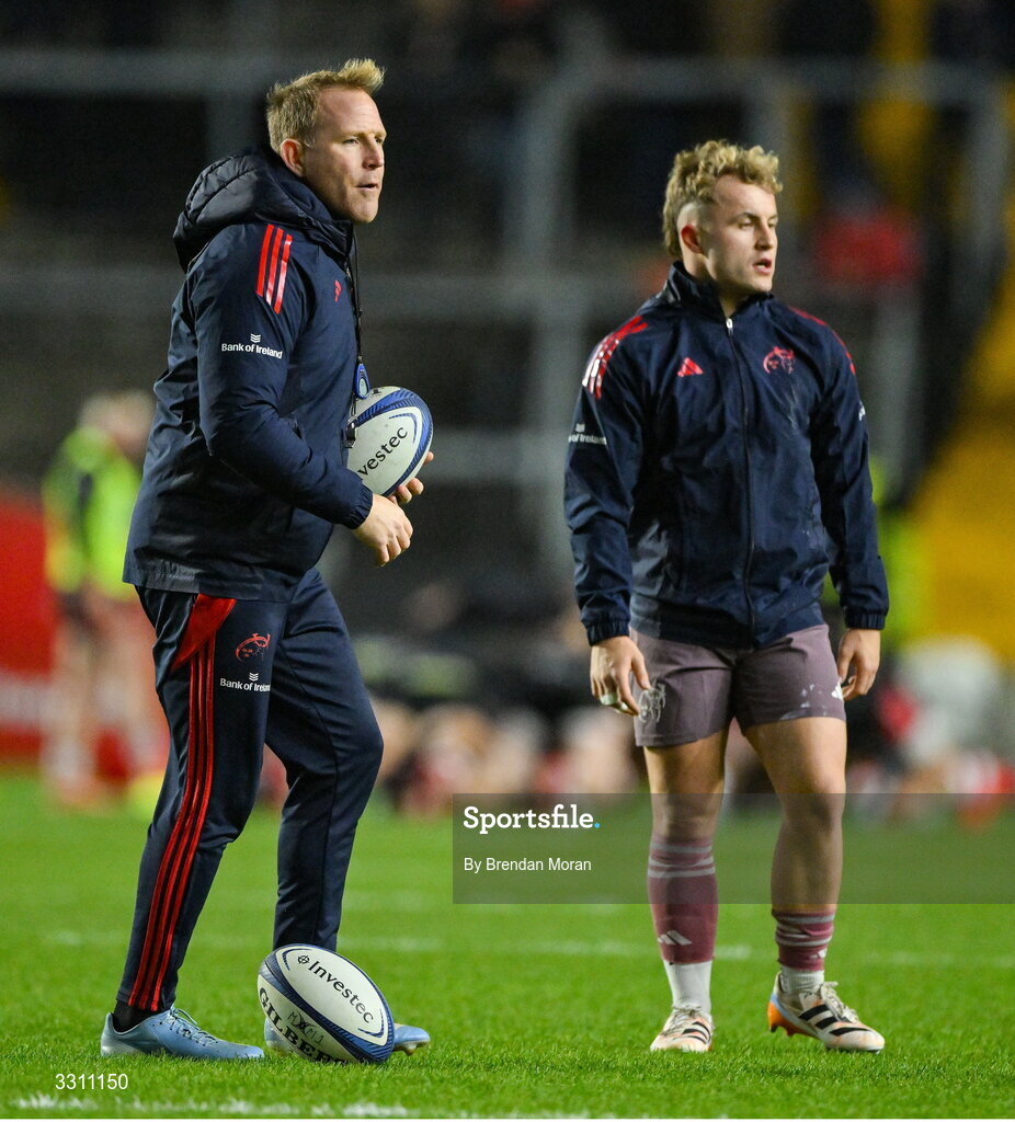 13 December 2025; Munster senior coach Mike Prendergast, left, and Craig Casey before the Investec Champions Cup match between Munster and Gloucester at SuperValu Páirc Ui Chaoimh in Cork. Photo by Brendan Moran/Sportsfile