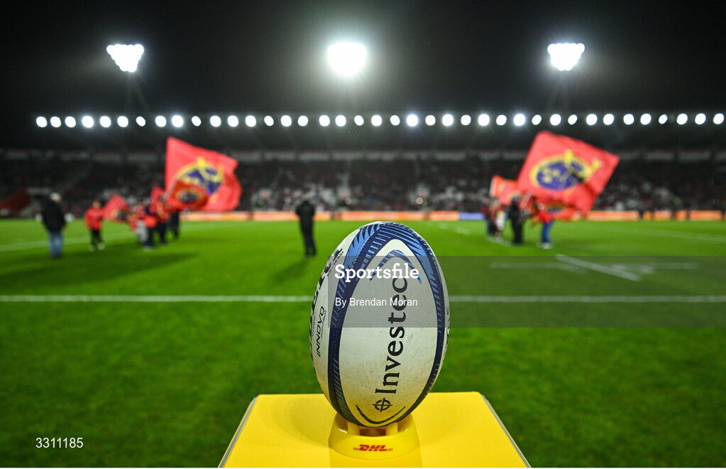 13 December 2025; A general view of a rugby ball pitchside before the Investec Champions Cup match between Munster and Gloucester at SuperValu Páirc Ui Chaoimh in Cork. Photo by Brendan Moran/Sportsfile