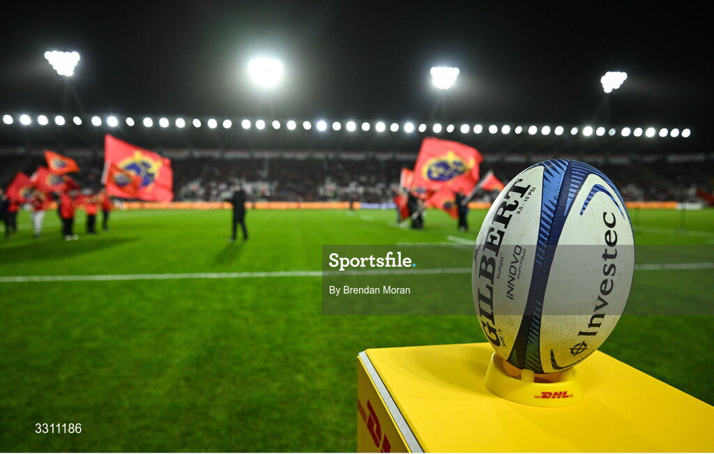 13 December 2025; A general view of a rugby ball pitchside before the Investec Champions Cup match between Munster and Gloucester at SuperValu Páirc Ui Chaoimh in Cork. Photo by Brendan Moran/Sportsfile