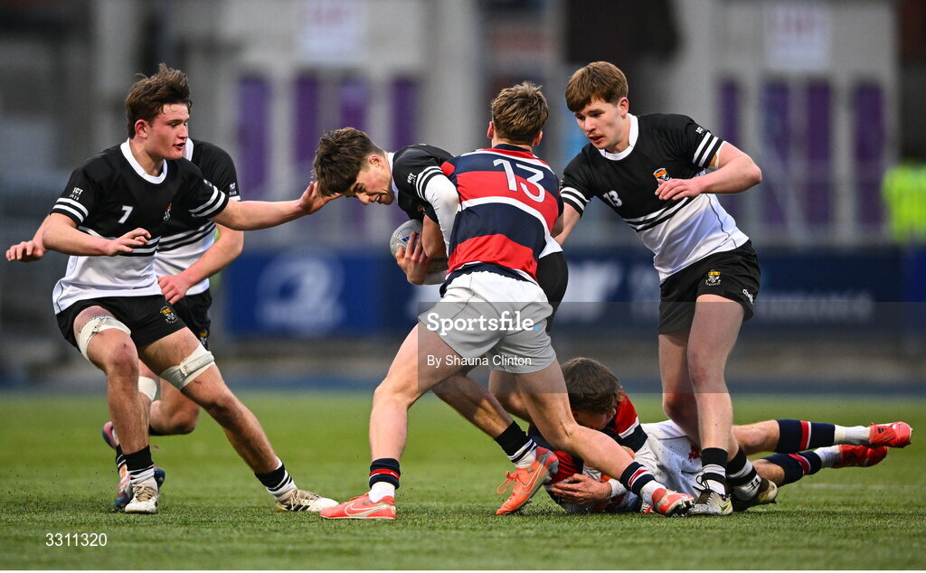 10 December 2025; Tom Martin of Newbridge College in action against Ruairi Fox of Wesley College during the Bank of Ireland Leinster Rugby Schools Senior League Division 1A final match between Newbridge College and Wesley College at Energia Park in Dublin. Photo by Shauna Clinton/Sportsfile