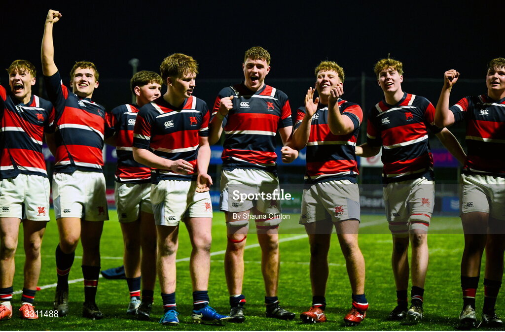 10 December 2025; Wesley College players, including captain Isaac Reid, centre, celebrate after the Bank of Ireland Leinster Rugby Schools Senior League Division 1A final match between Newbridge College and Wesley College at Energia Park in Dublin. Photo by Shauna Clinton/Sportsfile