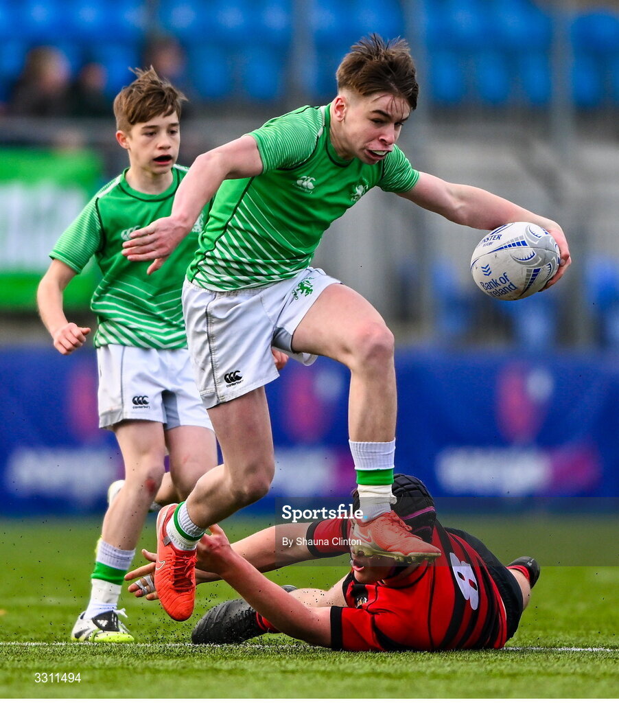 10 December 2025; Sean Fahey of Gonzaga College evades the tackle of Charlie Peavoy of Kilkenny College during the Bank of Ireland Leinster Rugby Schools Junior League Division 1A final match between Gonzaga College and Kilkenny College at Energia Park in Dublin. Photo by Shauna Clinton/Sportsfile
