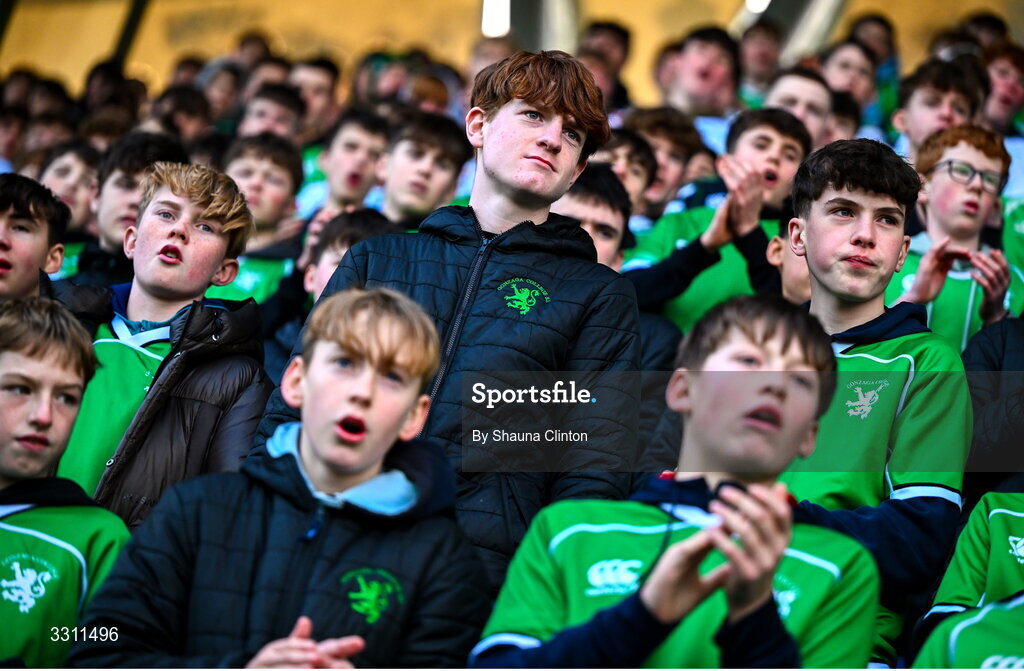 10 December 2025; Gonzaga College supporters during the Bank of Ireland Leinster Rugby Schools Junior League Division 1A final match between Gonzaga College and Kilkenny College at Energia Park in Dublin. Photo by Shauna Clinton/Sportsfile