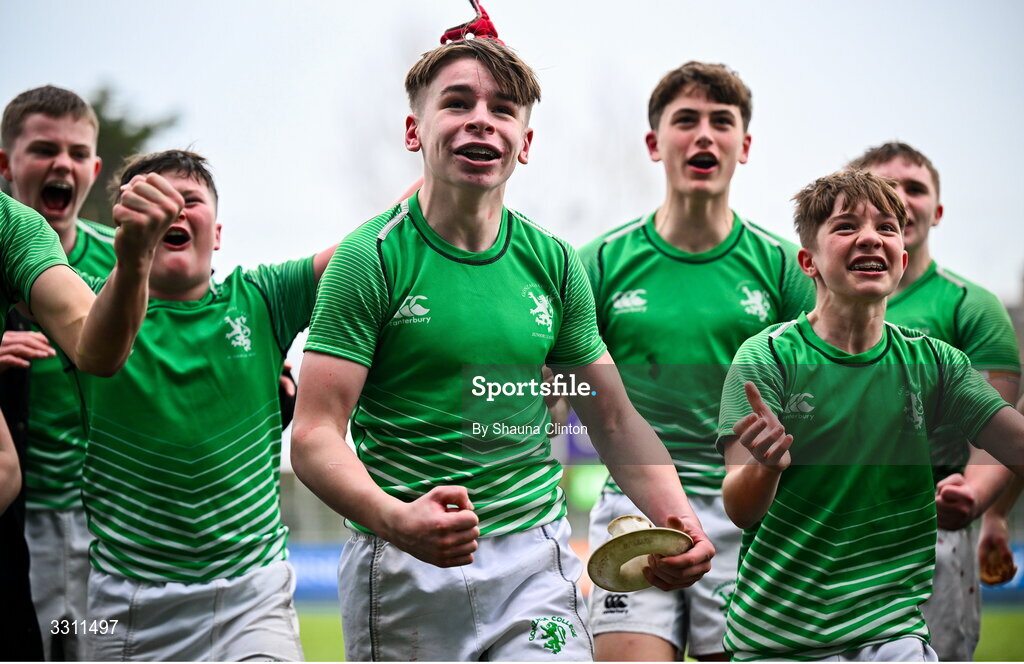 10 December 2025; Gonzaga College players, including Sean Fahey, centre, celebrate after their side's victory in the Bank of Ireland Leinster Rugby Schools Junior League Division 1A final match between Gonzaga College and Kilkenny College at Energia Park in Dublin. Photo by Shauna Clinton/Sportsfile