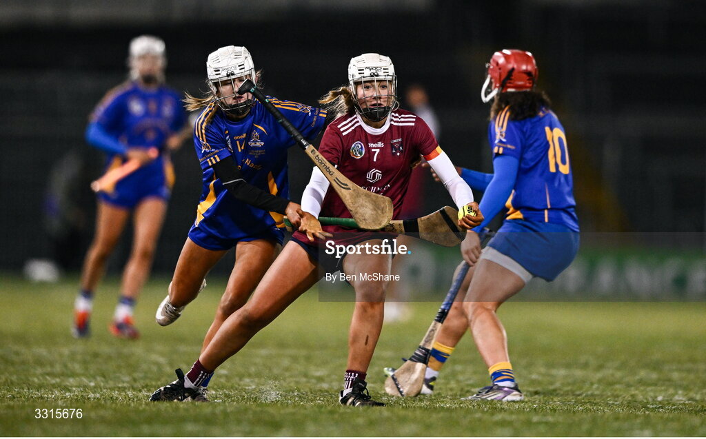 3 January 2026; Sinéad Feeney of Athenry loses her hurl as she is tackled by Nicole Olden, left, and Sorcha McCartan of St Finbarr’s during the AIB All-Ireland Camogie Senior Club Championship final replay match between Athenry of Galway and St Finbarr's of Cork at FBD Semple Stadium in Thurles, Tipperary. Photo by Ben McShane/Sportsfile