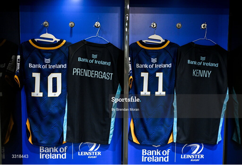 10 January 2026; The jerseys of Sam Prendergast, left, and Joshua Kenny in the Leinster dressingroom before the Investec Champions Cup match between Leinster and La Rochelle at the Aviva Stadium in Dublin. Photo by Brendan Moran/Sportsfile