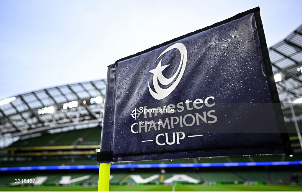10 January 2026; A tournament branded sideline flag before the Investec Champions Cup match between Leinster and La Rochelle at the Aviva Stadium in Dublin. Photo by Seb Daly/Sportsfile